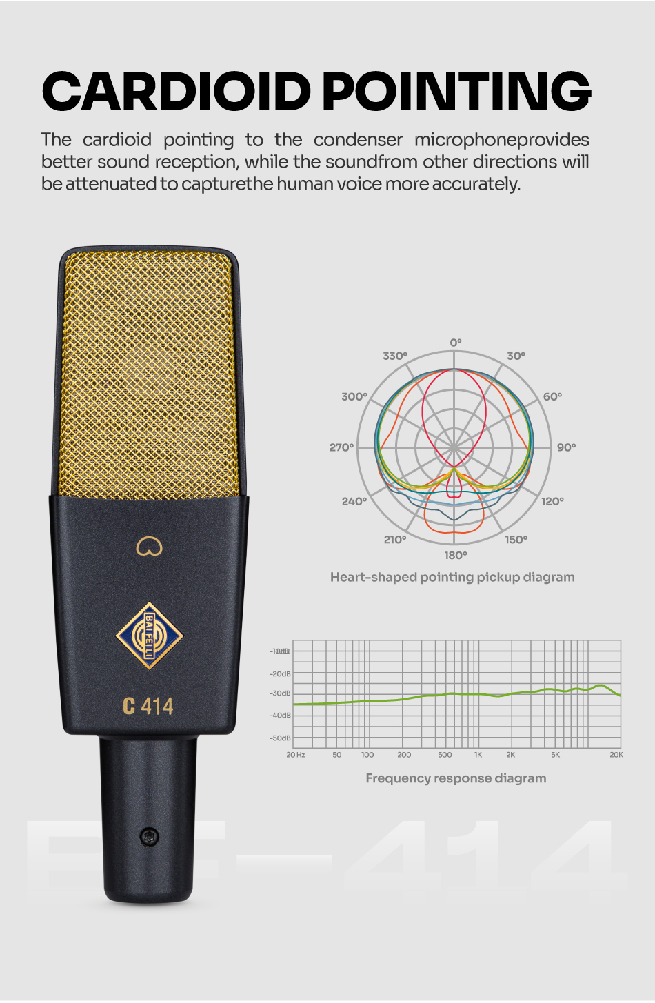 BAIFEILI C414 Professional Portable Metal Condenser Microphone with Stand for Gaming Recording Youtube Chatting